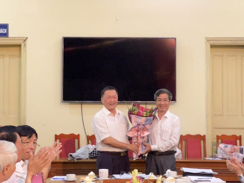 TS. Hoàng Văn Kể tặng hoa chúc mừng TS. Bùi Thanh Tùng - Tân Chủ tịch Liên hiệp các Hội Khoa học và Kỹ thuật Hải Phòng